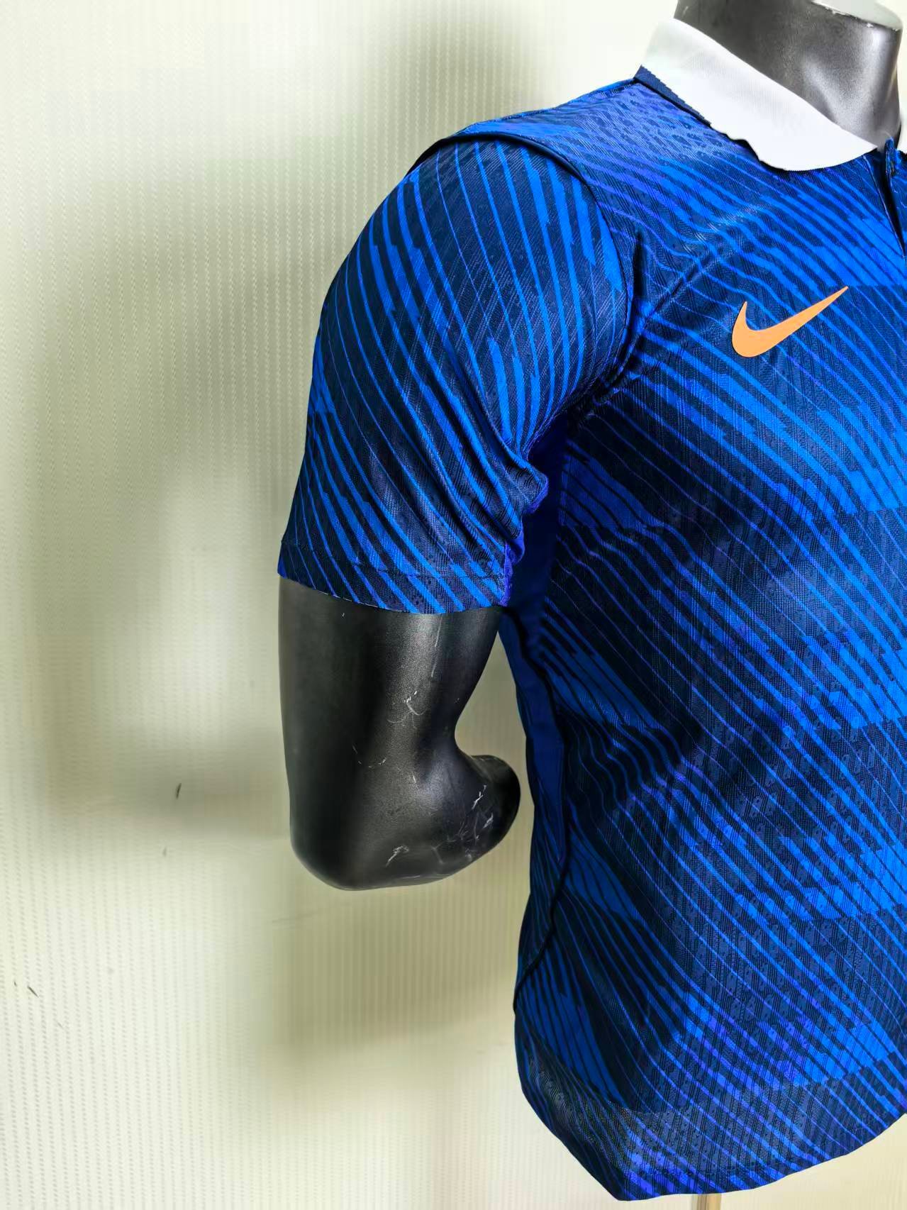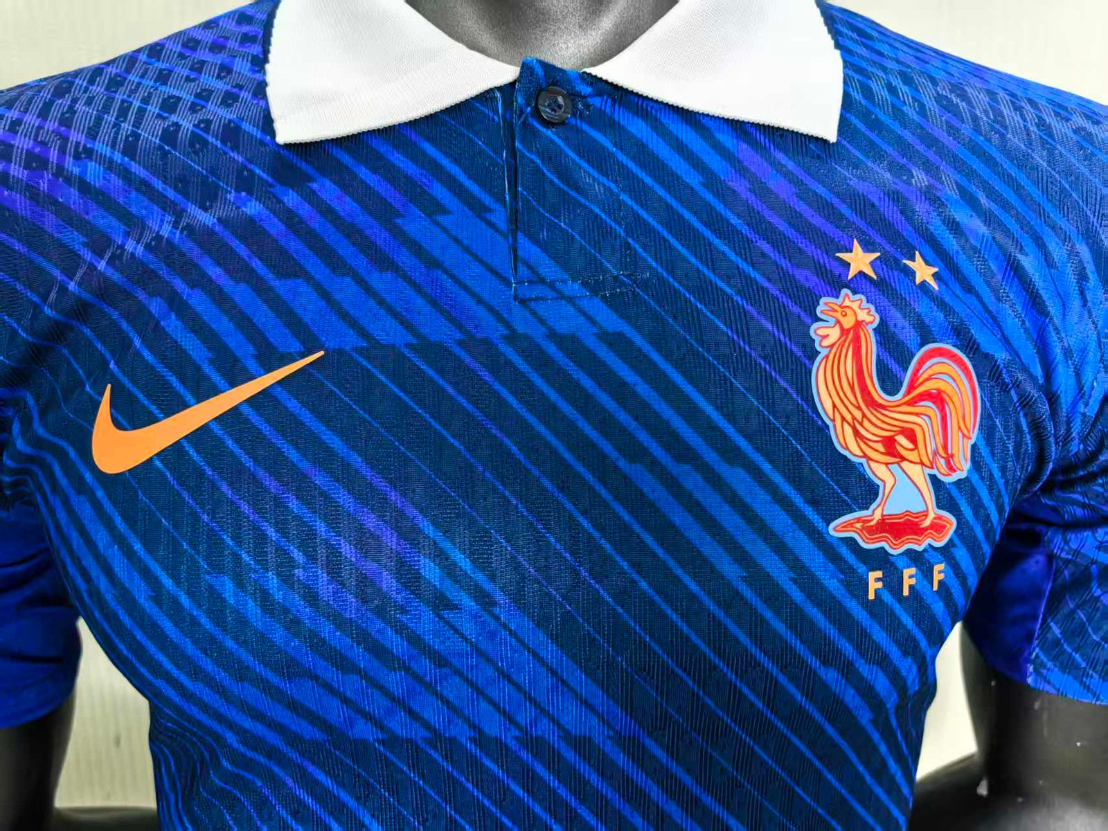 All-Over FFF Pattern: The jersey features a modern, all-over navy graphic pattern based on the FFF (Fédération Française de Football) logo. This intricate texturing gives the kit a premium, high-fashion feel that is distinctly French.