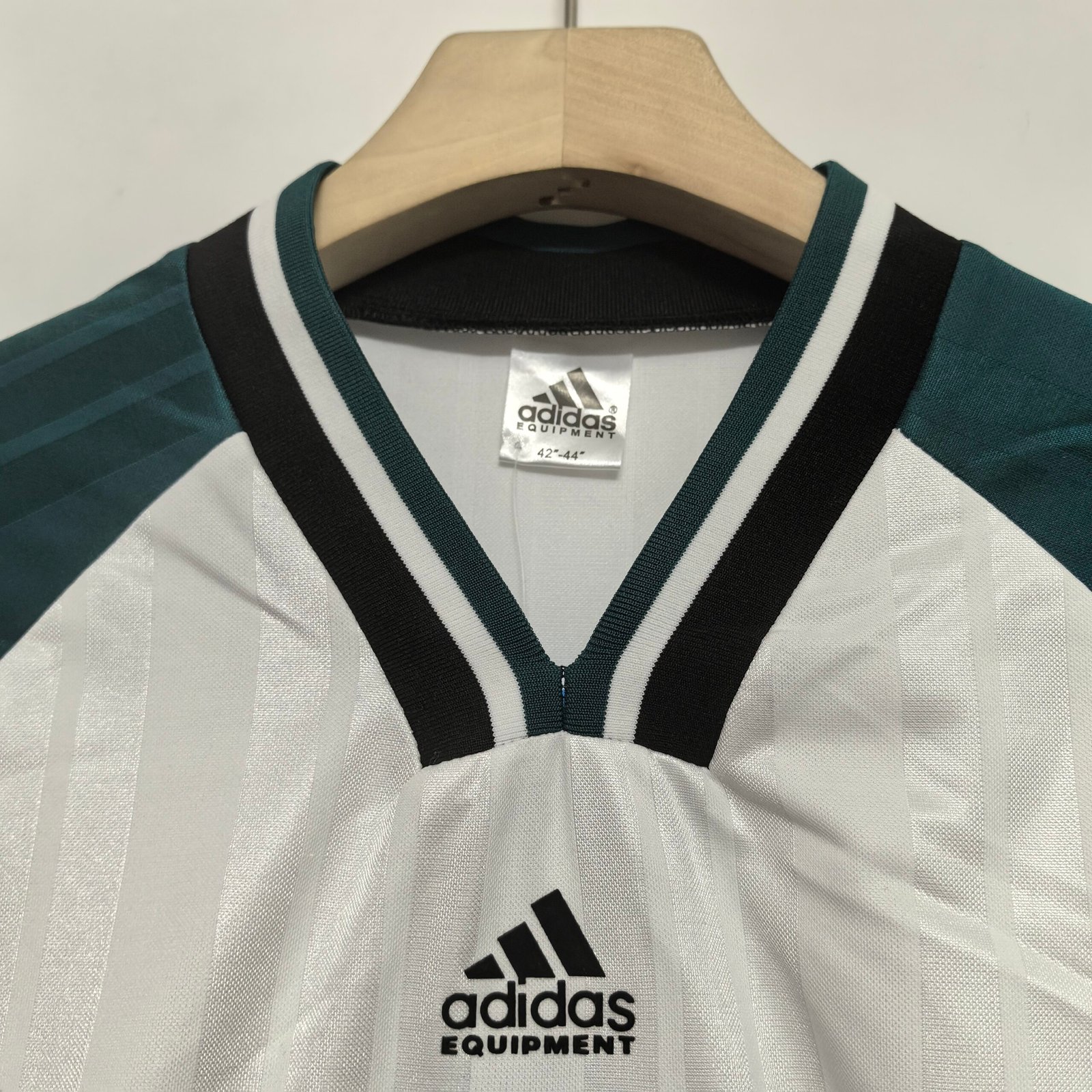 This jersey belongs to the iconic Adidas Equipment line of the mid-90s. Its defining feature is the three massive green stripes that wrap around the ribs, paired with a sophisticated black and green collar. It was the shirt worn during the 1994-95 season when Liverpool lifted the League Cup at Wembley, signaling the return of silverware to Anfield.