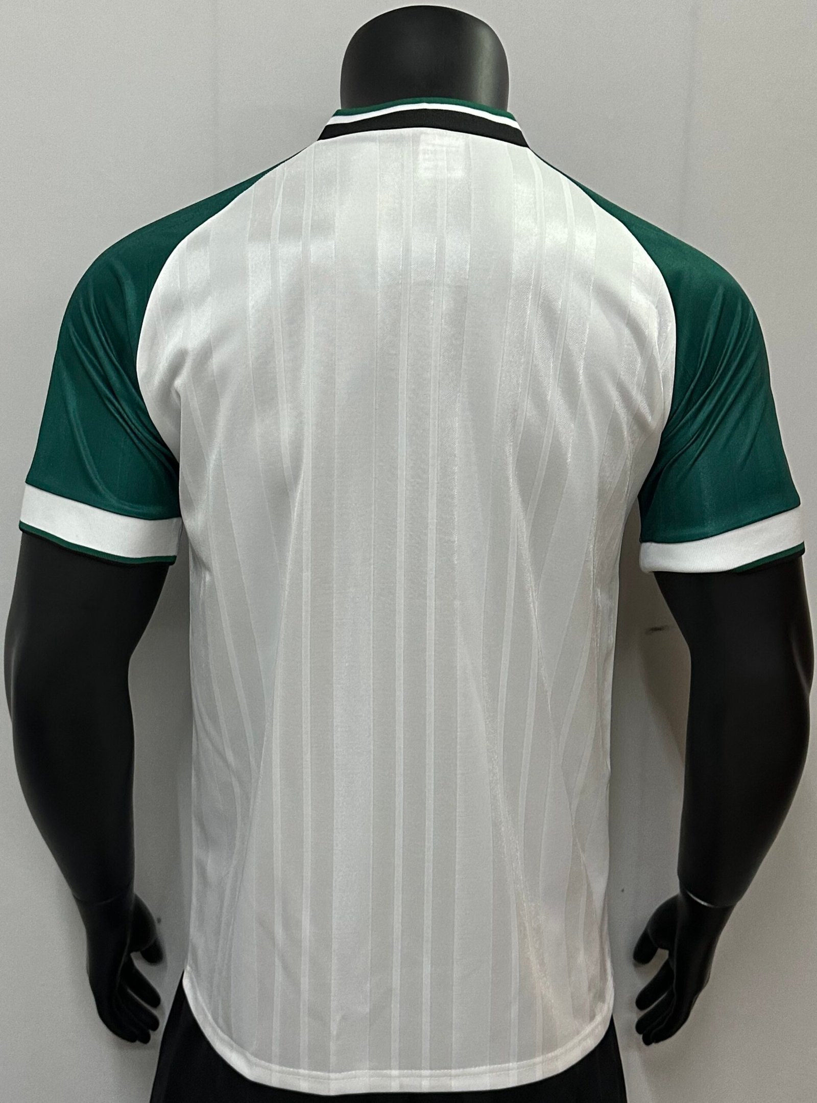 Signature 90s Collar: A thick, ribbed black V-neck collar with green and white tipping, offering a look that transitioned perfectly from the pitch to 90s street fashion.