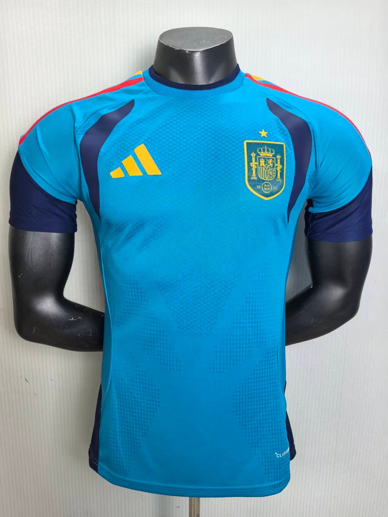 - Kit Design: The Adidas Spain 2026 World Cup training jersey features a bright blue base with deep navy panels and bright yellow Adidas branding.