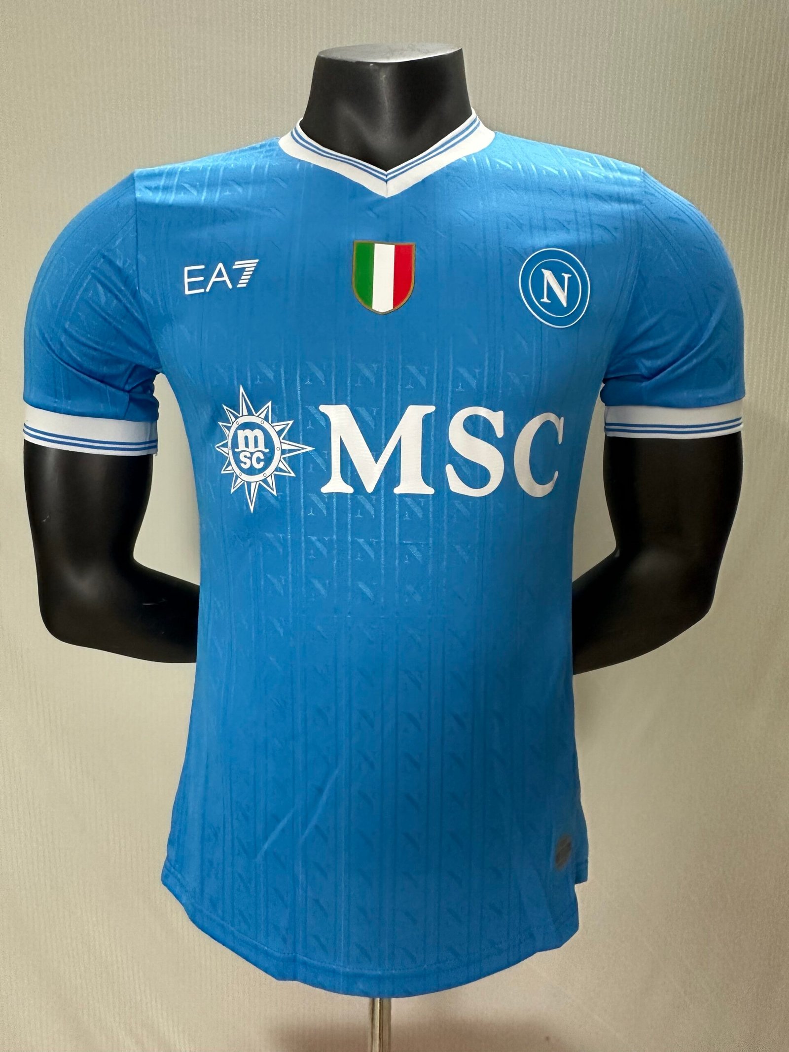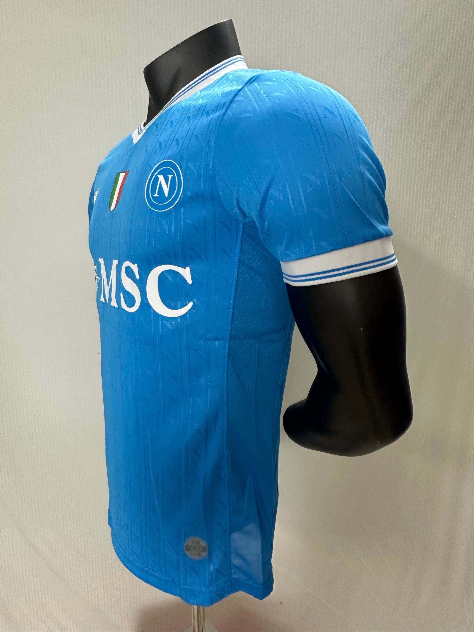 The match jersey, 90% polyester and 10% elastane, features the iconic Napoleonic “N” pattern within the weave of the fabric.